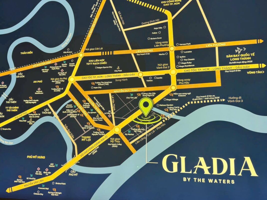 Gladia By The Waters sở hữu vị trí chiến lược trên trục Võ Chí Công, kết nối nhanh đến cao tốc Long Thành, Vành đai 2 và trung tâm Thủ Thiêm. Nằm ngay cửa ngõ khu Đông Sài Gòn, liền kề vòng xoay Mỹ Thuỷ và tuyến metro tương lai, Gladia mang đến lợi thế kết nối vượt trội.